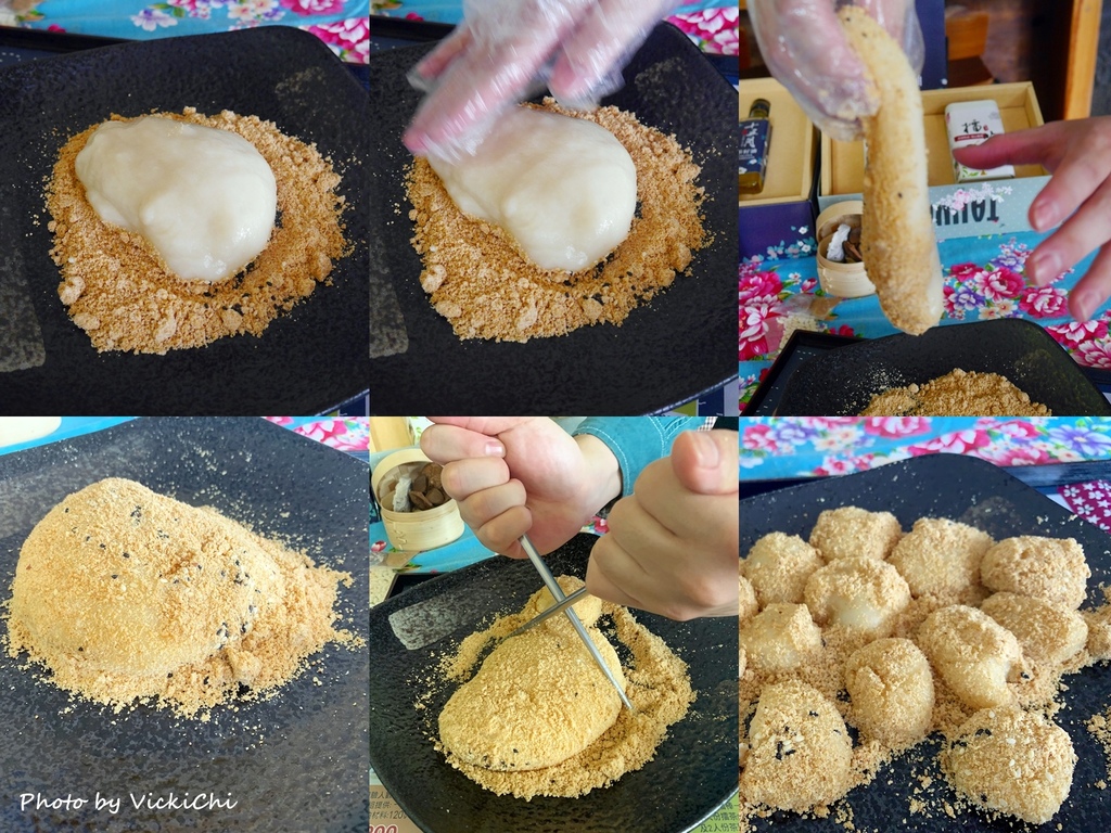 經過木杵的搥擊,讓麻糬有很長的延展性。和閩南式麻糬最大的差別是客家麻糬的配料是沾花生粉及糖粉一起吃。用鐵筷把麻糬分成小塊,這個分法不太容易,常常會把花生粉噴出盤子外圍。搗好的麻糬和磨好的擂茶,現場就可以立即享用。