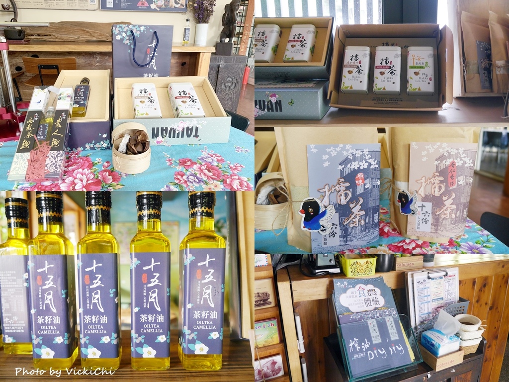 茶館除了提供DIY體驗課程和餐點外,門口提供還有自品牌的「十五月」茶籽油,「十五月」取自油茶果從開花結果到成熟摘果需要經歷漫長的15個月而命名,另外還有提供黑芝麻麵、擂茶等苗栗特色伴手禮及文創商品,非常適合當伴手禮送人!
