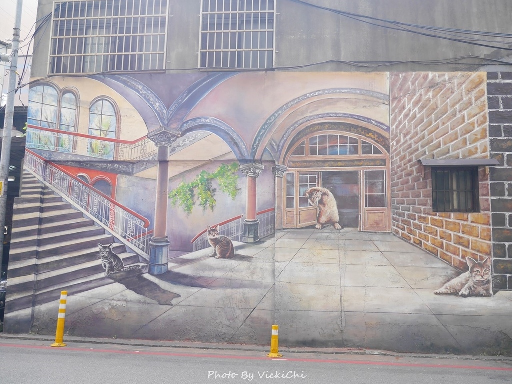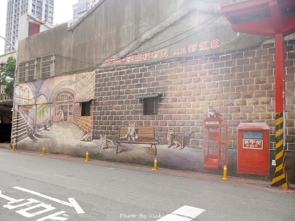 從捷運台北橋站出來,往文化南路直走,途中會看到福利里的貓咪3D彩繪牆,一大面可愛的貓咪彩繪。以往這樣的彩繪牆,時常會有車子停,這裡沒有車子或是垃圾遮到這幅圖,可以盡情地拍照,只要注意來車就行了!