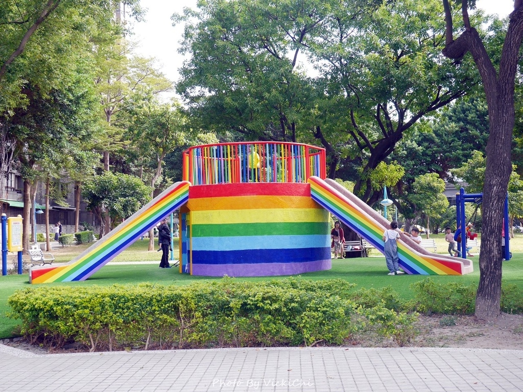 繼續往前走,到文化南路與福德南路路口,看到彩虹溜滑梯就是同安公園。我覺得這裡是大台北超好玩親子樂園之一,這裡有轉盤、彈跳床、盪鞦韆等等共融式遊樂設施,繼續往前走就是空軍三重一村。