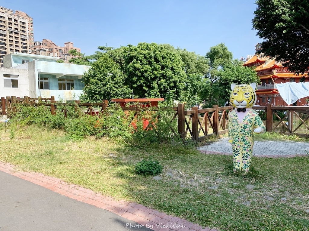 在園區的外圍可以看到穿花西裝的老虎,這是藝術家依照保生大帝的坐騎「醫虎喉」,創作出可愛的老虎塑像。如果去廟裡,會發現保生大帝的神像經常被塑成有虎為作伴或是以騎虎姿態出現。