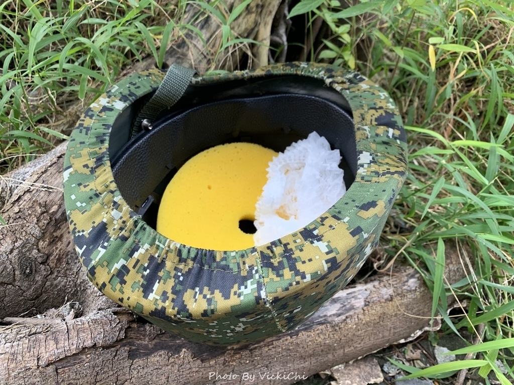 體驗前會拿到一頂鋼盔還有白色浴帽,因為甬道很矮又很窄,戴鋼盔可以保護好自己的頭。