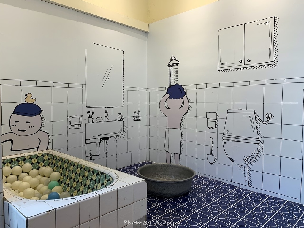不愧是將軍的眷舍,浴室空間如果沒有改建的話,那真的是好大阿!中間的不鏽鋼盆,從小時候到現在,家裡都用這個裝水洗澡。這裡的浴室也是大家爭相前來拍美照的地方,現在變了很多。過了一年,球變少了...