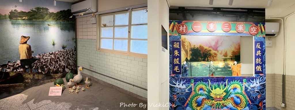 當時的假日,在空地上有布袋戲的演出,吸引大批人潮。那個時代的演出,劇情多半是反共抗俄、殺朱拔毛的反共情節,從這些故事反映了當時的社會環境。在這裡可以把玩布袋戲的玩偶,看到這個不免想到黃俊雄布袋戲曾經出現行走江湖的中國強,「中國強,中國強,中國一定強!」。