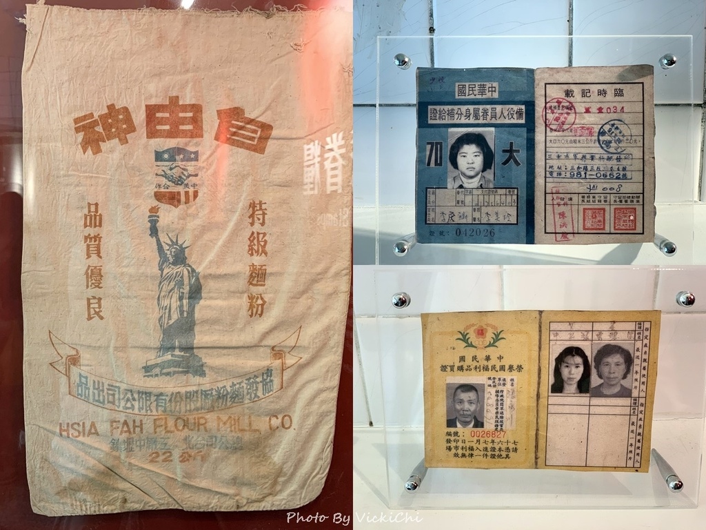 走到後面的廚房,展示早期眷村的米糧袋,還有牆上貼滿一張張的眷補證和糧票。