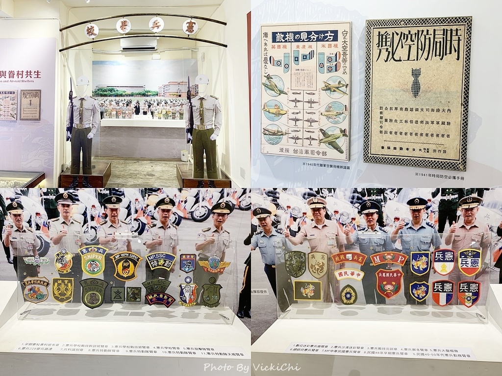 展示不同時期的憲兵臂章,1953年在正義南路上的憲兵學校,在1970年的五月遷至五股,後來在2004年11月合併林口憲兵訓練中心為憲兵學校林口分校,最後在2014年4月1日,對!就是愚人節,憲兵學校改為憲兵訓練中心。而憲兵學校在三重的原址,現在則是光興國小。