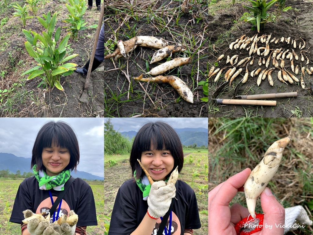大家待在葛鬱金田裡面,邊採收葛鬱金邊品嘗他的味道。生吃葛鬱金的感覺很像吃起來像玉米或甘蔗,口感有點渣渣的。然後我還挖到一個形狀超像台灣的葛鬱金,哈哈。