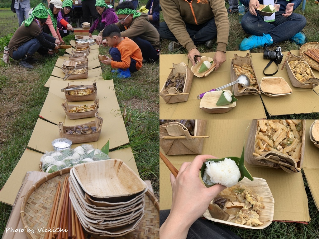 今天的吃午餐的地方是在田埂上,部落夥伴們用紙箱鋪在田埂上當做簡易的餐桌,準備了三樣簡單的菜色:菜圃蛋、山苦瓜炒豆乾、炒茄子和用竹桃葉包的白飯,吃完以後還有綠豆湯作為甜點。第一次在田埂上吃飯,特別新奇,還好天公伯給面子,天氣超好的,真開心!