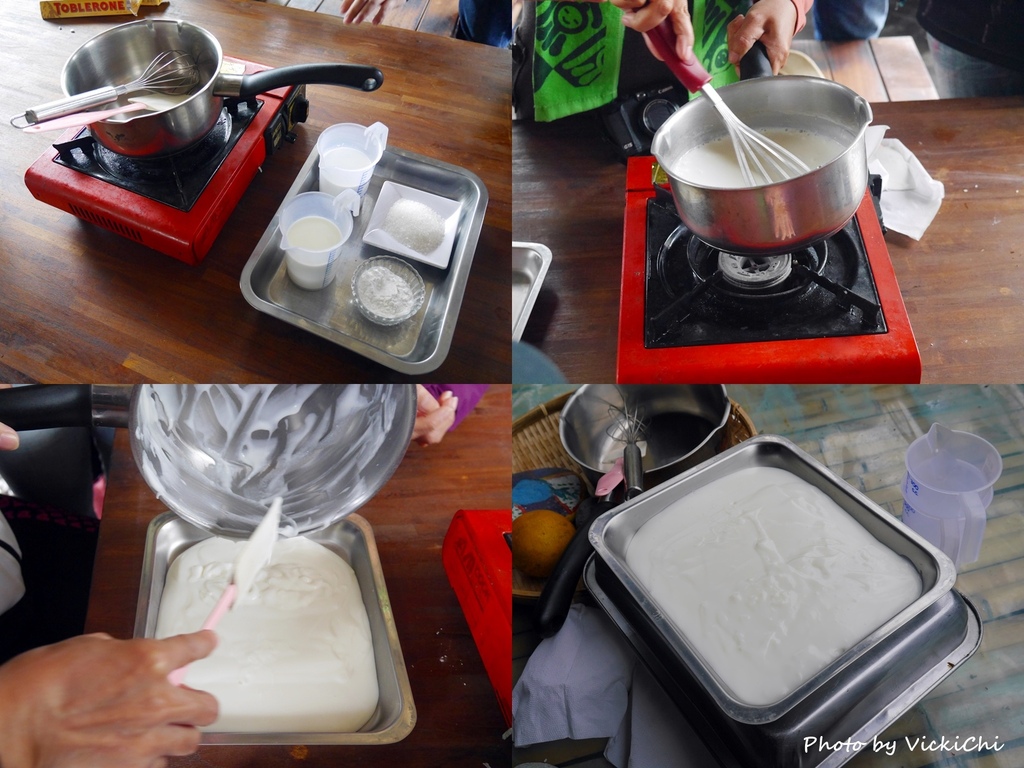 葛鬱金雪花糕,準備的材料有葛鬱金粉70克、砂糖50克、牛奶和椰奶各200cc。
