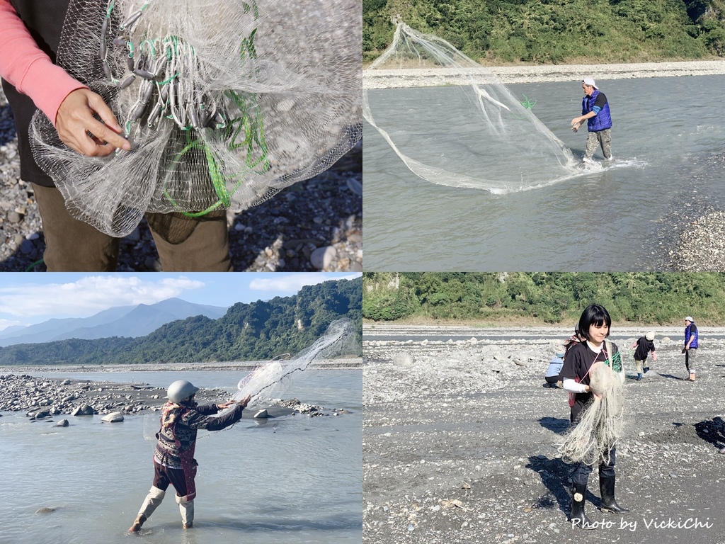 在旁邊看阿財撒網超酷的,我在岸上練習兩次後就跟著到溪邊撒網,結果沒有網到任何的魚。