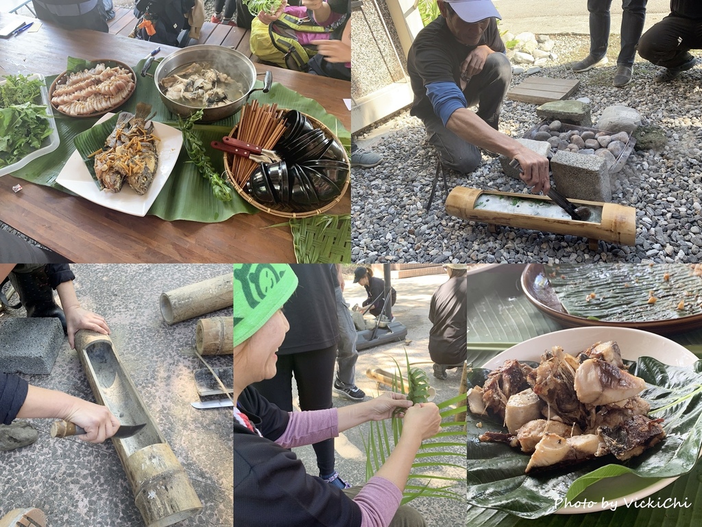 回到禮拜供處後,和部落夥伴們一起準備中午的石頭火鍋,喔耶!第二天撿的麥飯石,終於要派上用場了!分成三組:烤石頭、洗野菜和鋸竹筒。石頭火鍋就是要把麥飯石烤的高溫,然後放進竹筒裡面,所以麥飯石要找拳頭般的大小。
