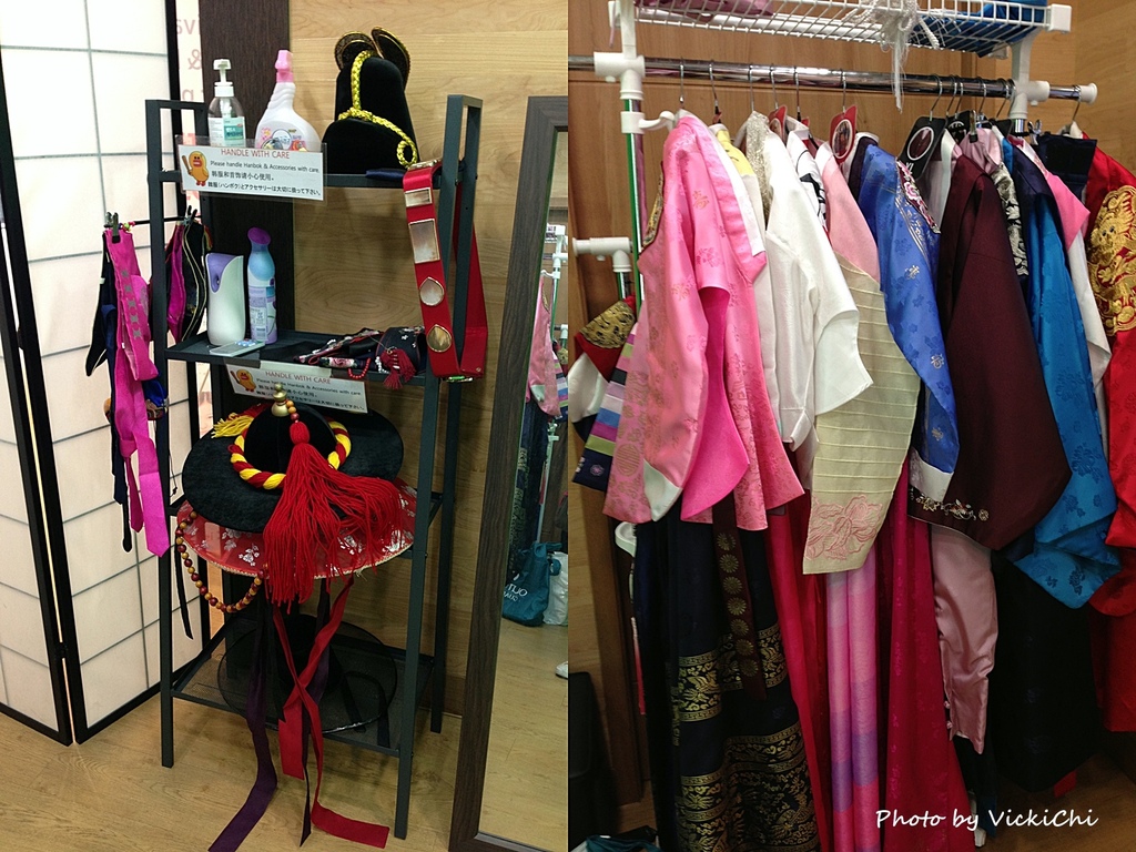 中心裡面提供的韓服,男女生都有,雖然韓服樣式不多,不過尺寸都有特別標示,發現還有王室的服裝。挑件自己喜歡的韓服穿,旁邊還有帽子、頭飾等配件,雖然是免費體驗但不馬虎,穿整套韓服好好體驗。