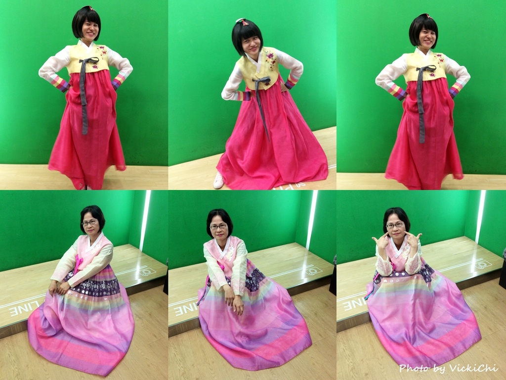 在明洞旅遊資訊中心的韓服寫真,只要站在綠色背景前面對鏡頭就能拍照。就算是單獨前往體驗韓服也不用拜託別人幫忙,在前面的觸控螢幕裡,可以選擇六款不同的場景,媽媽覺得實在太有趣了!剛好我們後面沒有遊客前來預約,連續拍了好幾張。