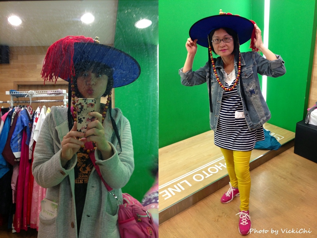 挑選韓服外,順便試戴看看韓國古裝劇男主角的帽子。