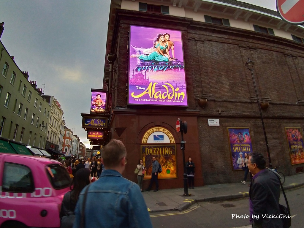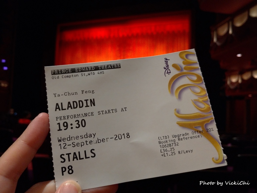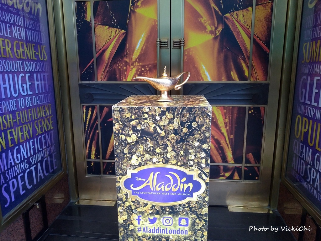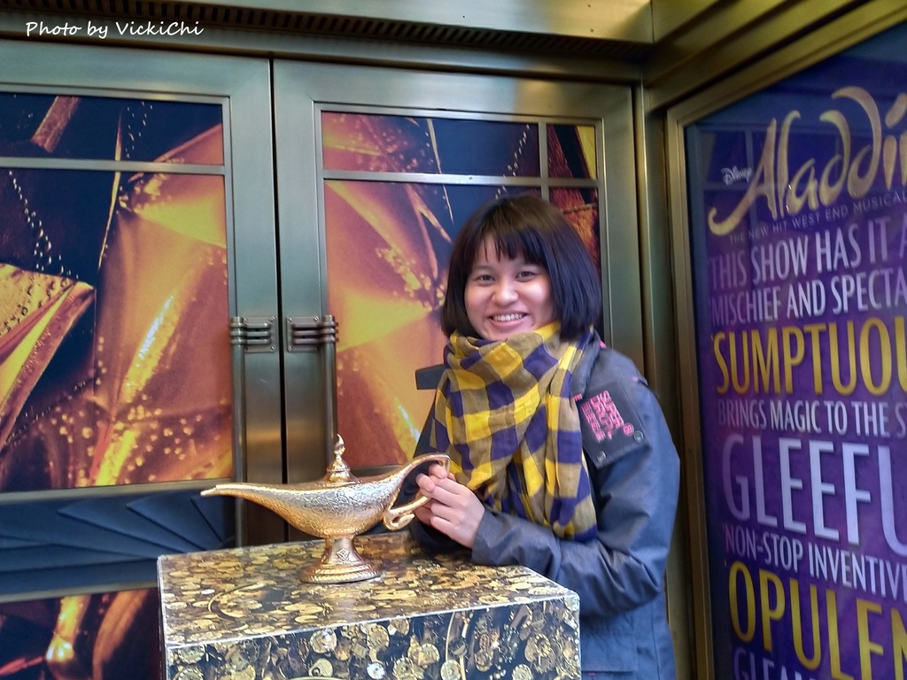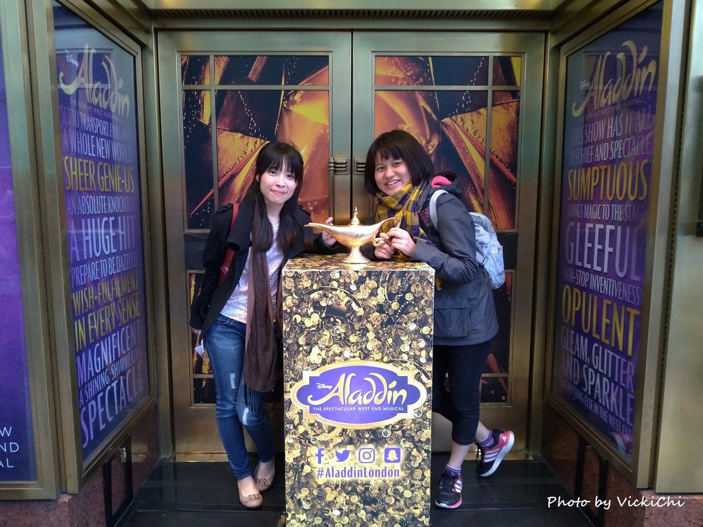 在計畫到倫敦旅行前,在倫敦讀書的好友熊貓兔,都坐飛機從台灣遠赴一趟到倫敦,建議我到倫敦一定要安排到劇院看一場音樂劇。倫敦很多劇院有不少的音樂劇,像經典的悲慘世界、歌劇魅影、獅子王還有哈利波特等等。於是,我挪動了在倫敦的行程,騰出了一晚的時間和熊貓兔一起看戲。我們選了最熟悉的Aladdin(阿拉丁),作為我初次在劇院的音樂劇體驗。