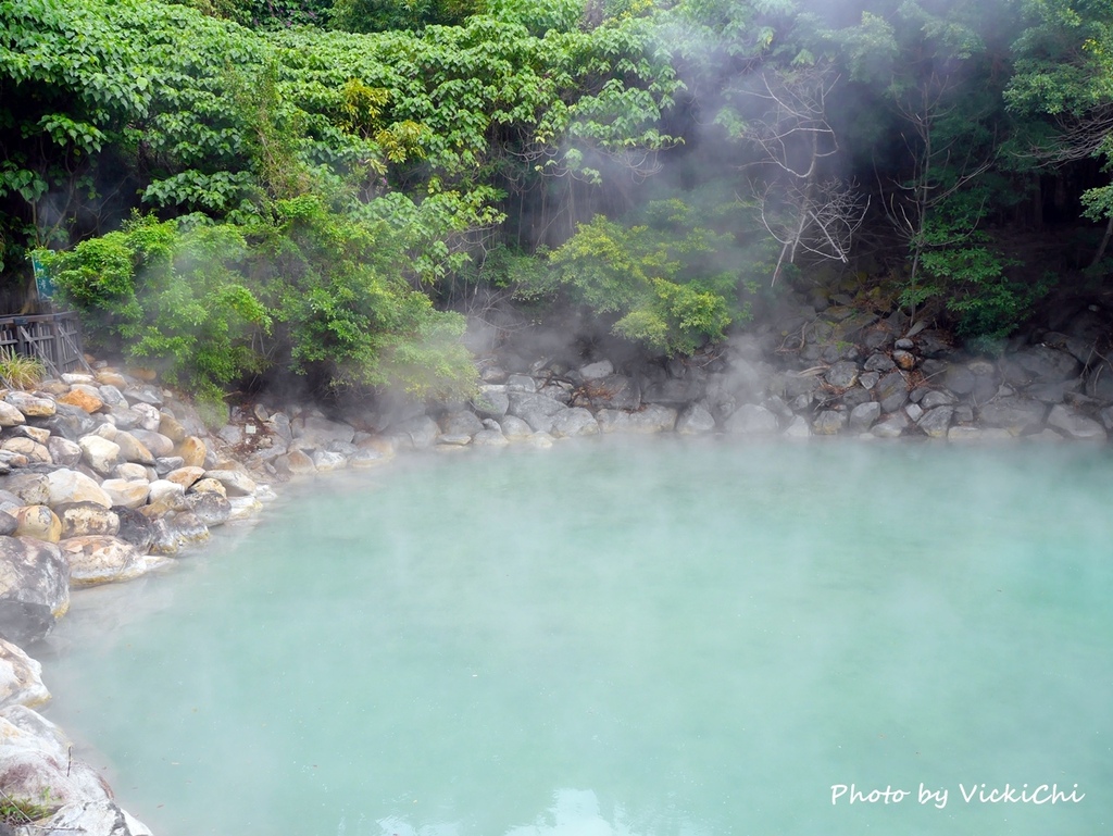 地熱谷的泉水屬酸性的青磺泉,水質清澈且帶點微綠的色澤。水溫高達約攝氏90度,如沸湯地獄般,從地底下冒出源源不絕的滾燙沸水,空氣中瀰漫著硫磺煙霧,所以這裡也被稱為「地獄谷」或「鬼湖」,但我個人覺得把這裡稱為地獄谷,頗讓人傷心的。