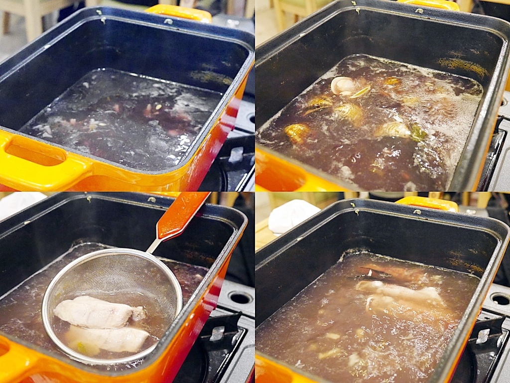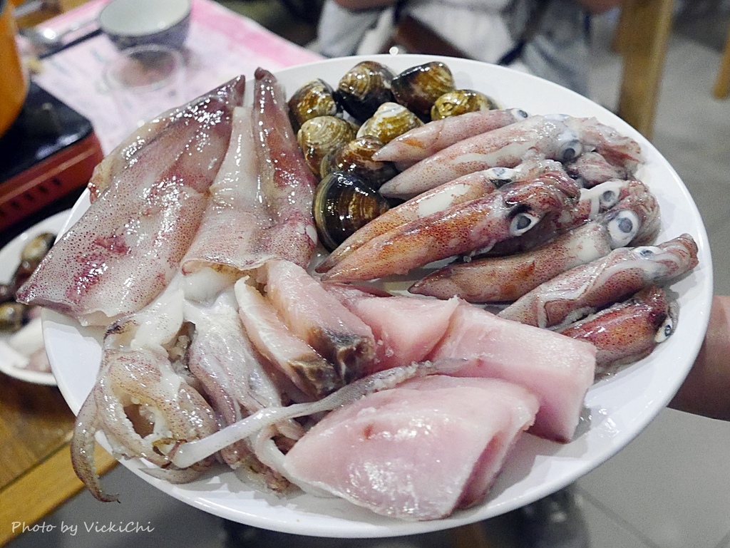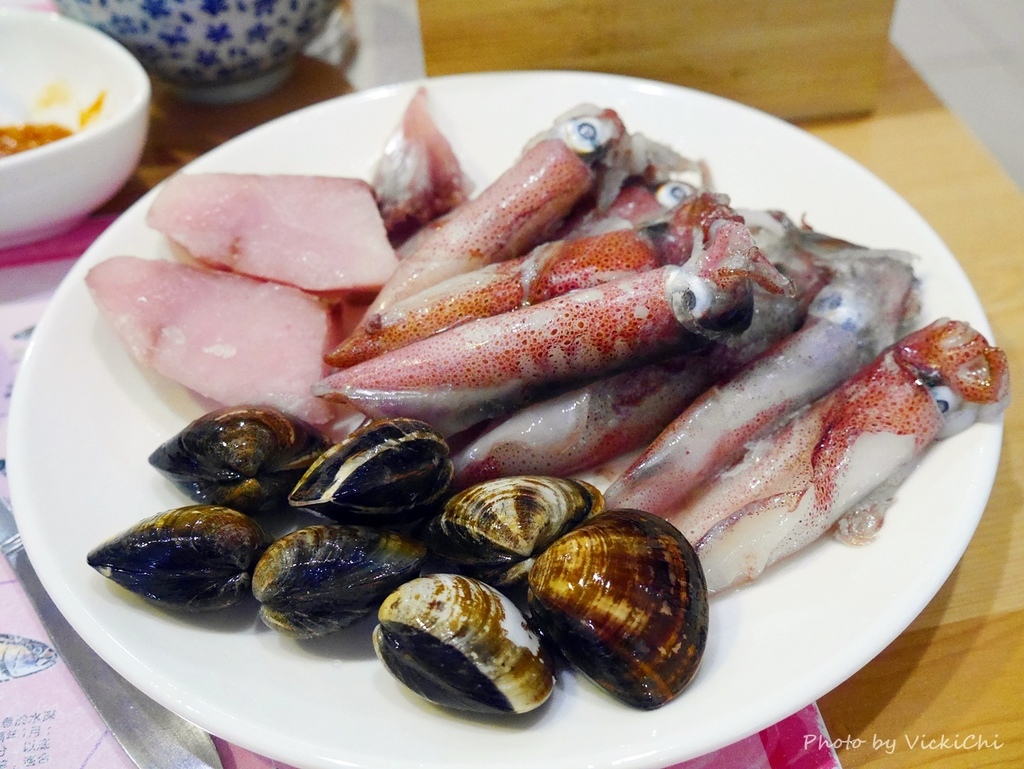 八斗邀的漁夫鍋,海鮮盤不會跟著蔬菜盤一起上桌,而是放在最後壓軸,在吃過幾輪蔬菜後,接著就是煮海鮮。雙人的漁夫鍋的海鮮盤有蛤蜊、鬼頭刀和小卷。