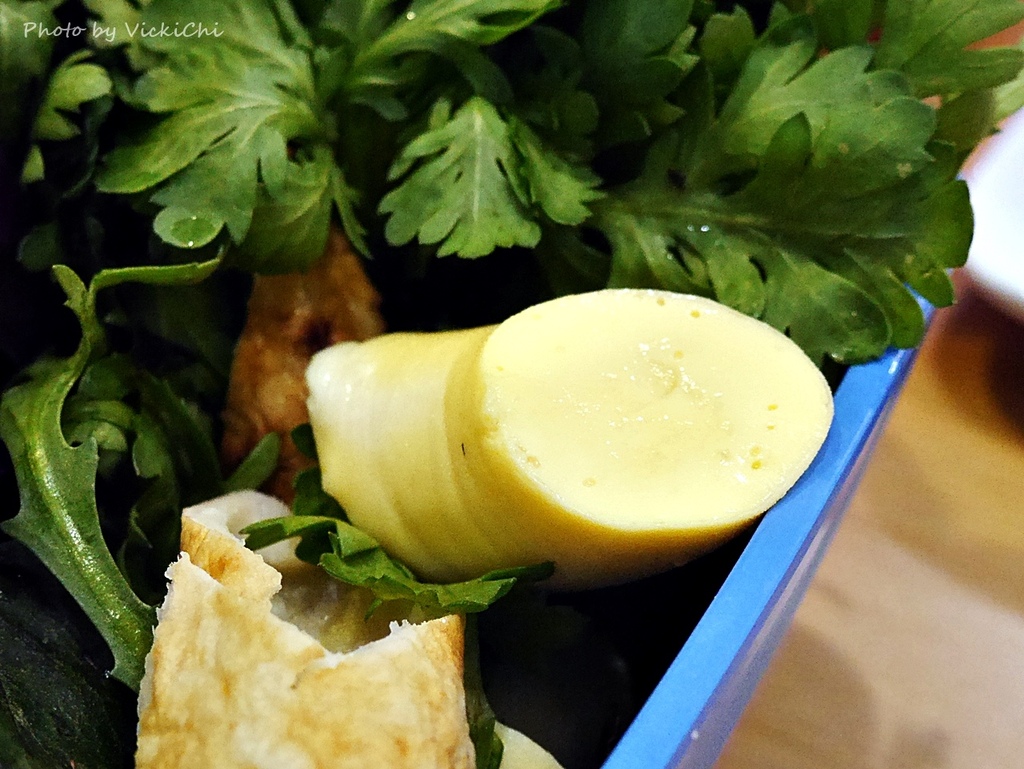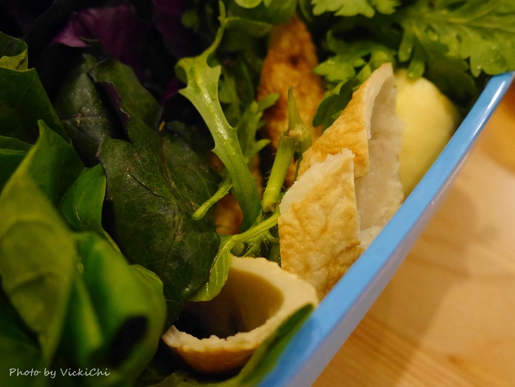鍋內擺滿著白色根莖蔬菜作為開頭,以蔬菜熬煮的清湯,清甜的口感和以往以昆布熬煮的湯頭很不一樣。接著依據放入深綠色的蔬菜和飛魚卵丸、吉古拉和蛋腸。