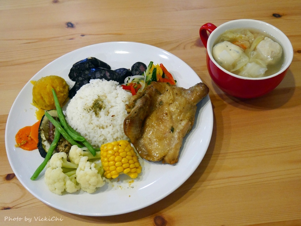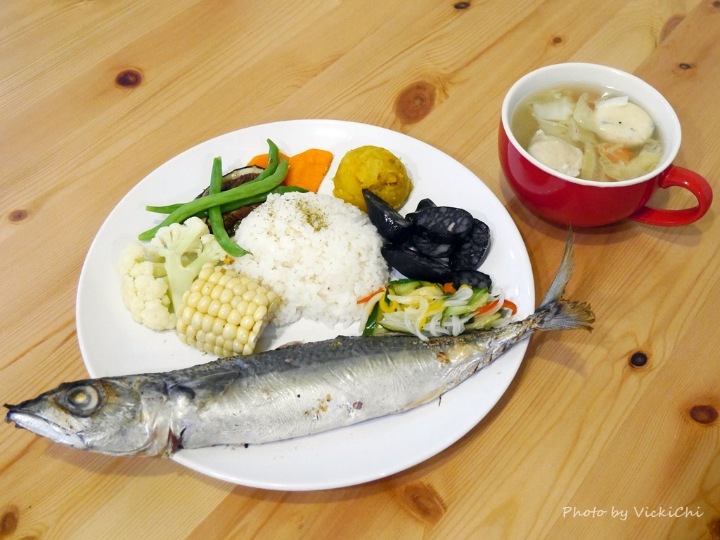 除了漁夫鍋,這裡也提供簡餐。有白腹鯖(當季魚類為主)、雞排和鎖管三種主菜可以選擇,我們選了白腹鯖跟雞排兩份套餐,套餐上還有飛魚卵香腸、時蔬、配一碗無農藥的飯,再喝一碗魚丸湯,宜蘭友善農法小鶹米及綜合魚丸湯,整套簡餐吃得飽飽飽。