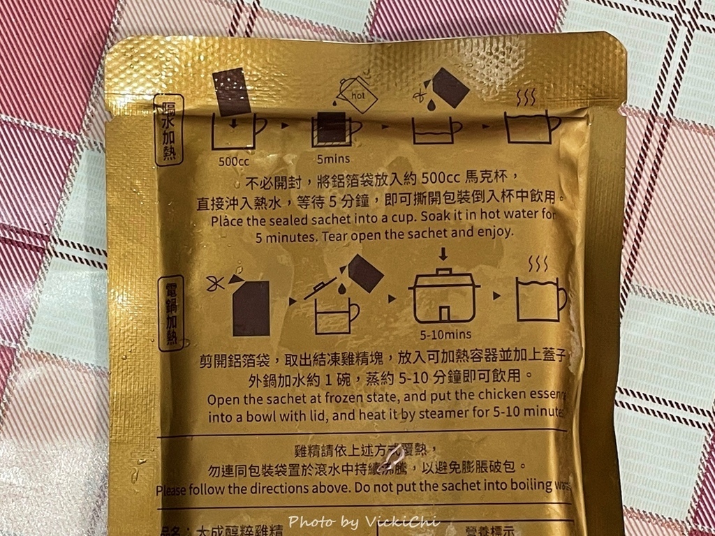 飲用雞精時,由於雞精採用四層不透光鋁箔袋包裝,材質經TAF認證實驗室檢驗,符合食品器具衛生包裝標準,可以放心將鋁箔袋隔水加熱或是剪開包裝倒在杯中以電鍋加熱,簡單又快速,我個人喜歡以電鍋加熱的方式加熱雞精。