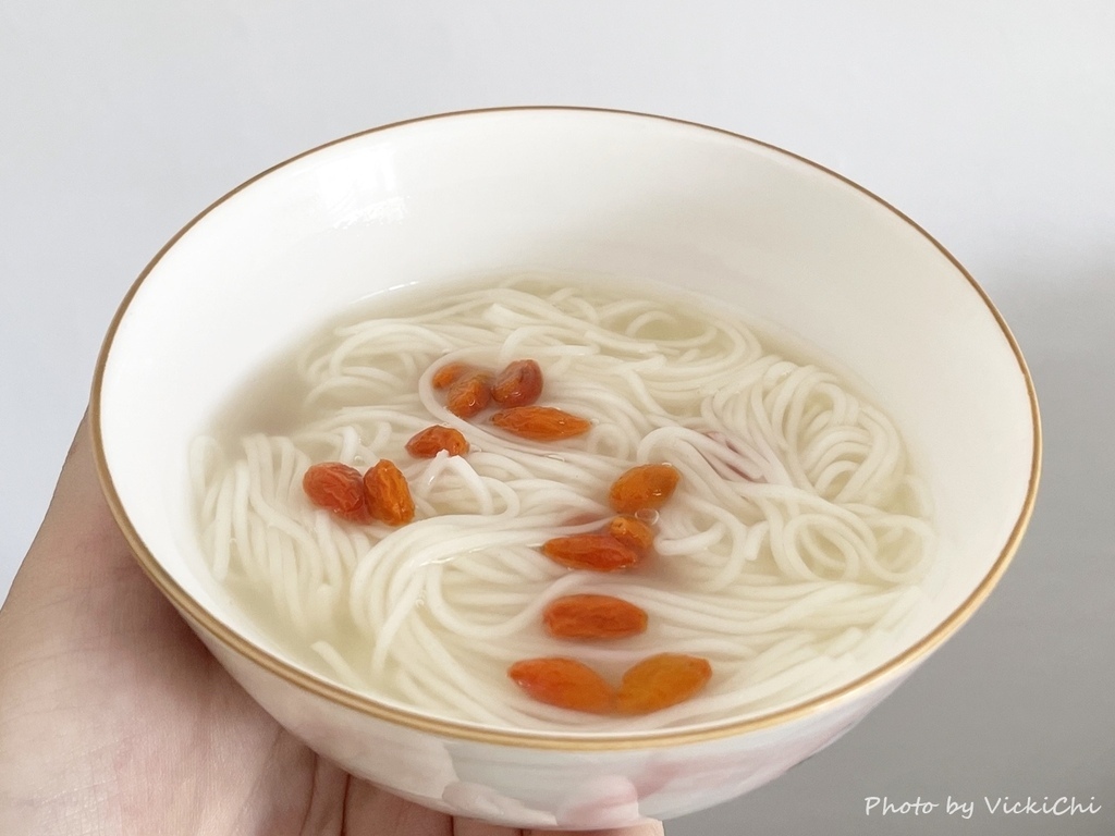 除了單喝,因為大容量的關係,就想來試試看「醇粹雞精麵線」。還加了一點枸杞增色,賣相還可以,沒有另外調味的話,吃起來就是沒有調味的雞湯麵線,加點鹽巴就更順口。