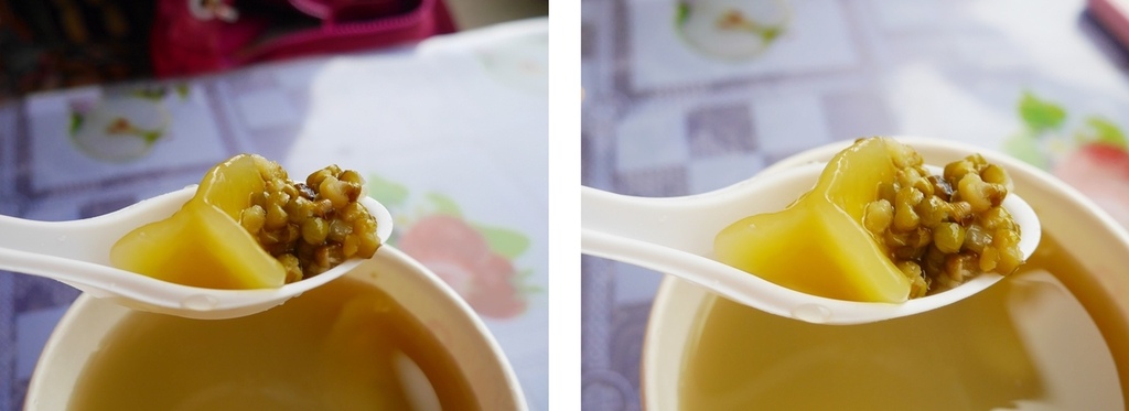 婆婆在廟旁邊擺了幾張桌子當作內用區,原本我們以為黃金餃是做鹹的,直到看著婆婆在盛裝黃金餃的碗裡面,加入綠豆湯,當下我們才恍然大悟,啊!原來黃金餃是甜的。