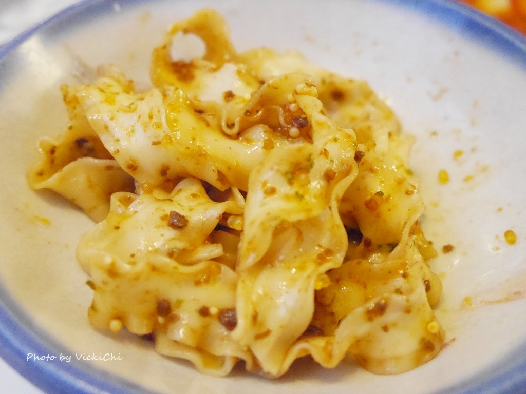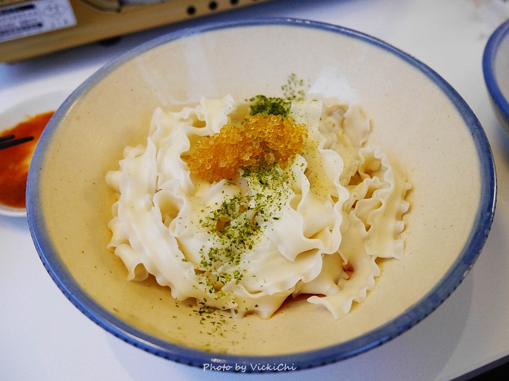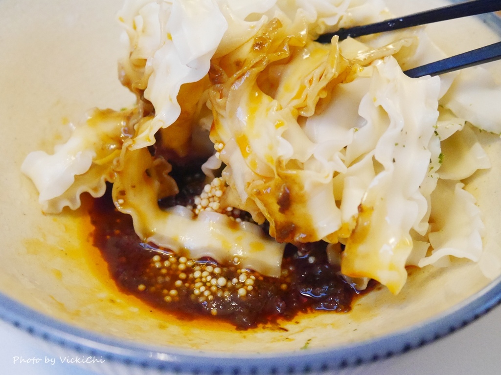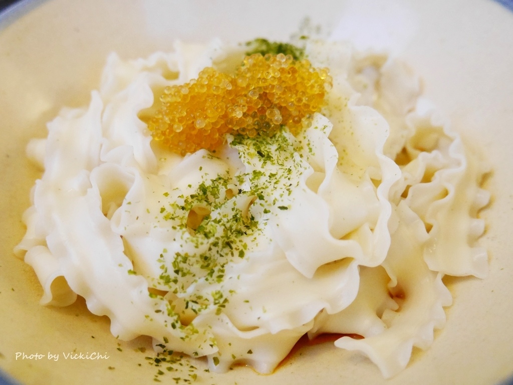 Q彈口感的關廟乾麵,用老闆收藏的古碗盛裝著,再搭配上顆顆分明金黃色的飛魚卵和石蓴,最後再淋上特製的椒麻香醋醬,最後攪拌均勻就可以了!