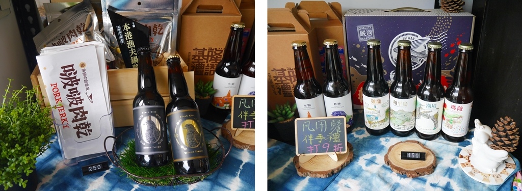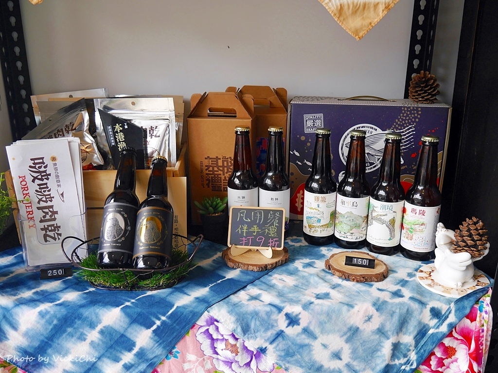 餐桌旁邊擺放著基隆在地精釀啤酒和啵啵肉乾,讓大家可以在這裡買到基隆遊玩的特色伴手禮,用餐的話伴手禮還有9折優惠。