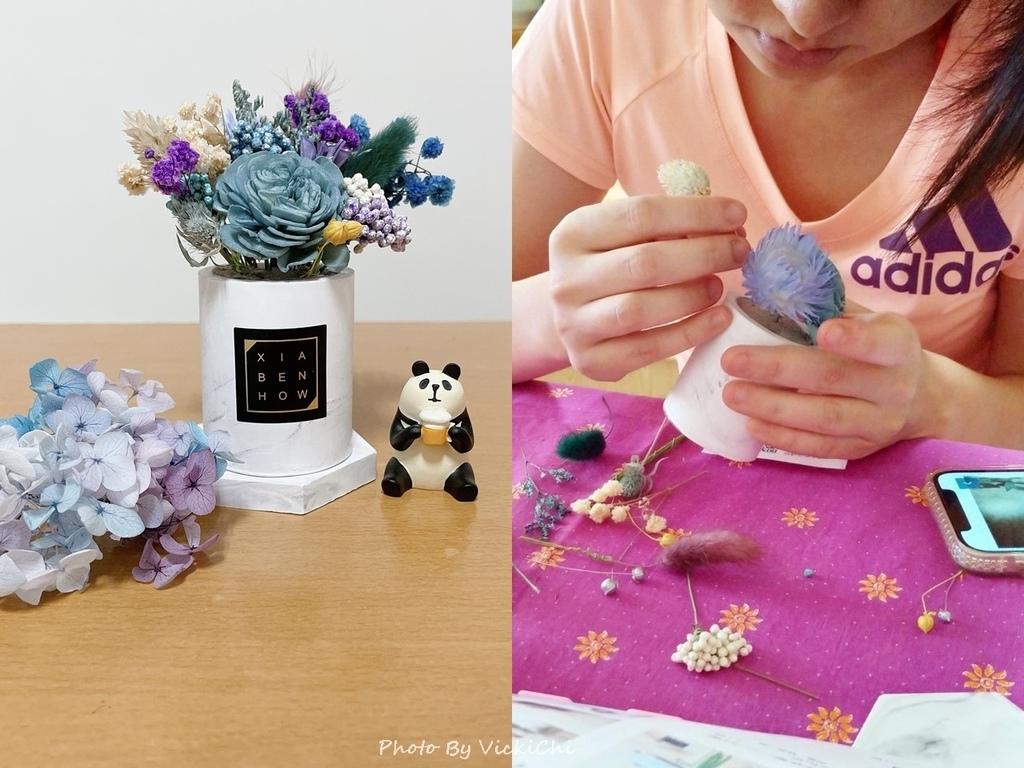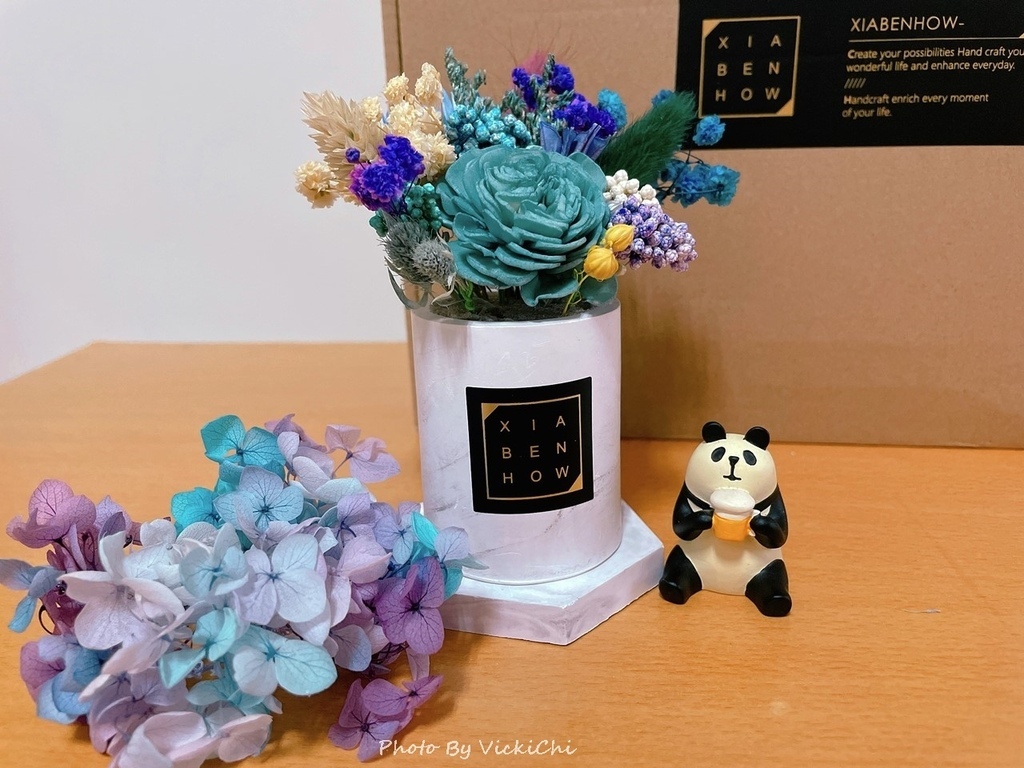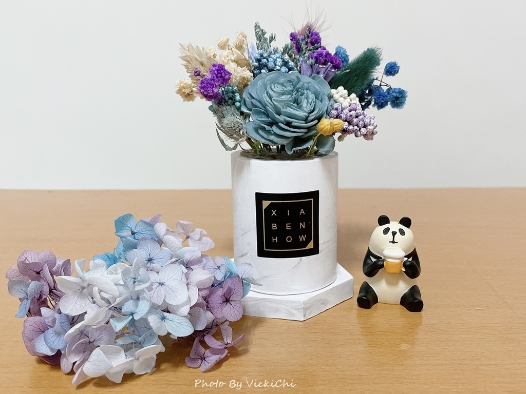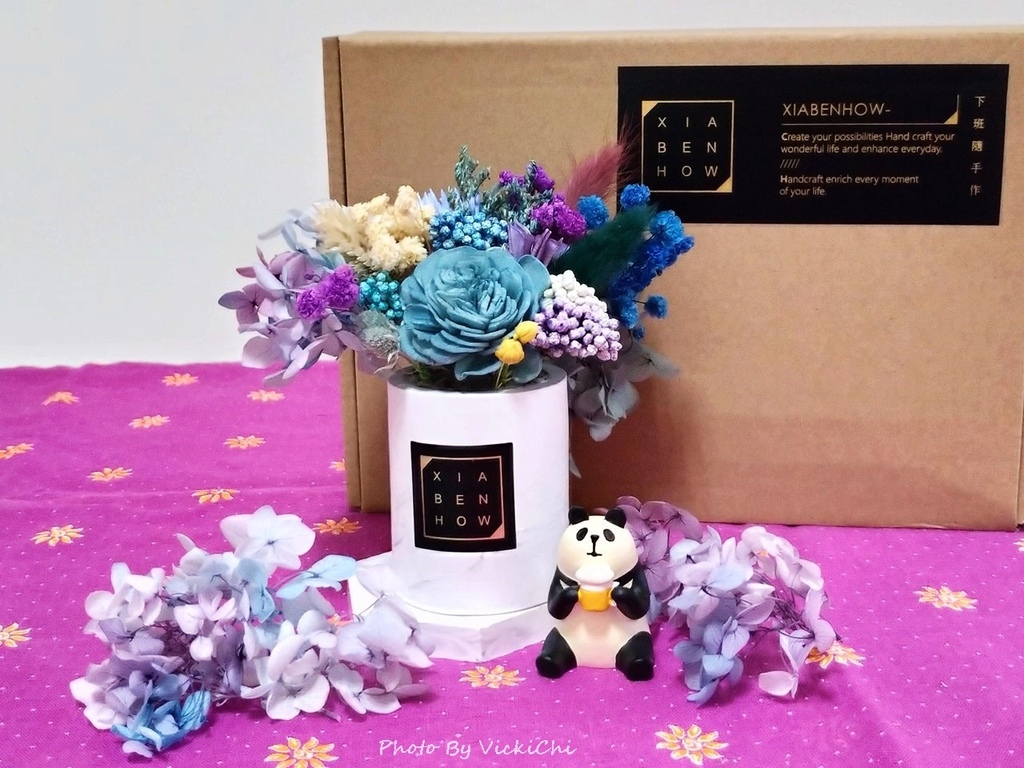 看著自己插好的乾燥花,越看越喜歡,搭配普羅旺斯的特調香味,讓整個空間香起來,心情也頓時放鬆,喝酒的熊貓先生在花盆旁邊喝著酒,實在太療癒。