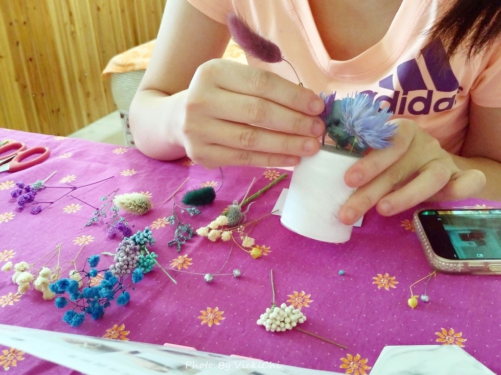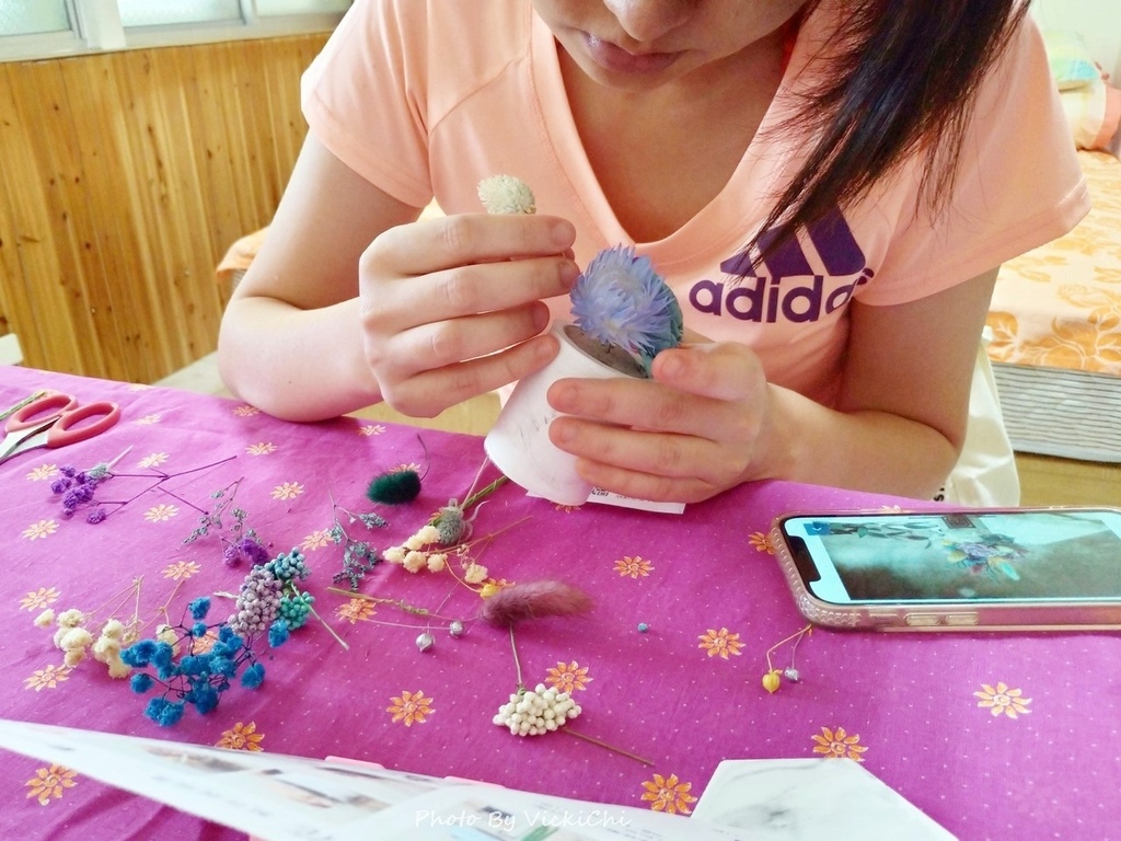 一邊完成擴香花,途中還跑去泡個茶喝,可說是邊喝茶邊照著說明影片插好花。最後在花盆裡的索拉花上,滴上材料包裡面附的香氛精油就大功告成。