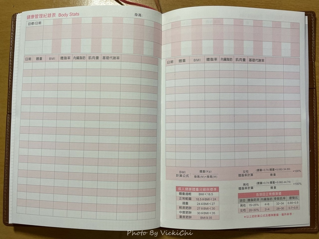 手帳還附有健康管理表,可以記錄自己一年的體重變化。右邊還有計算公式可以計算出「到底多胖?」,我大概有看到體重機才會用到這個紀錄表,非常適合減重的人做紀錄。