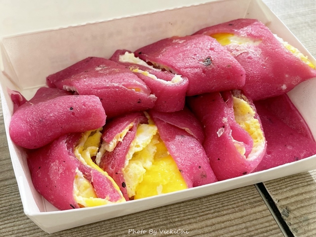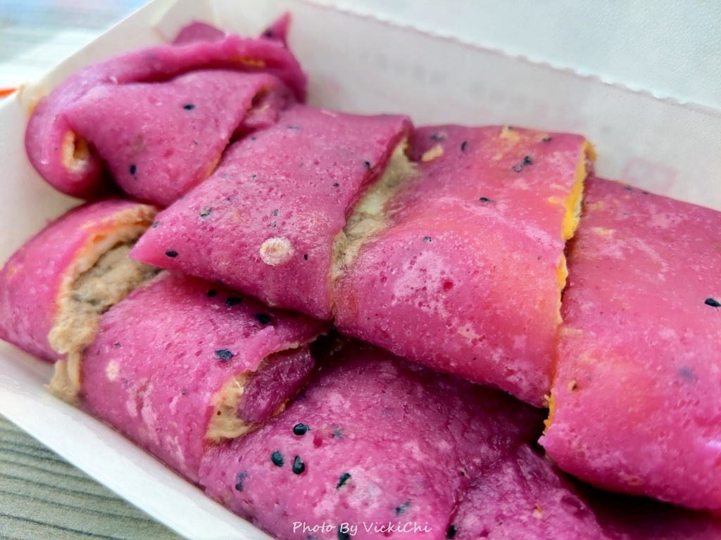 今日的蛋餅餅皮口味有三種:竹炭、九層塔和紅龍果。看到紅龍果口味是最喜歡的桃紅色,立刻決定好餅皮的口味。