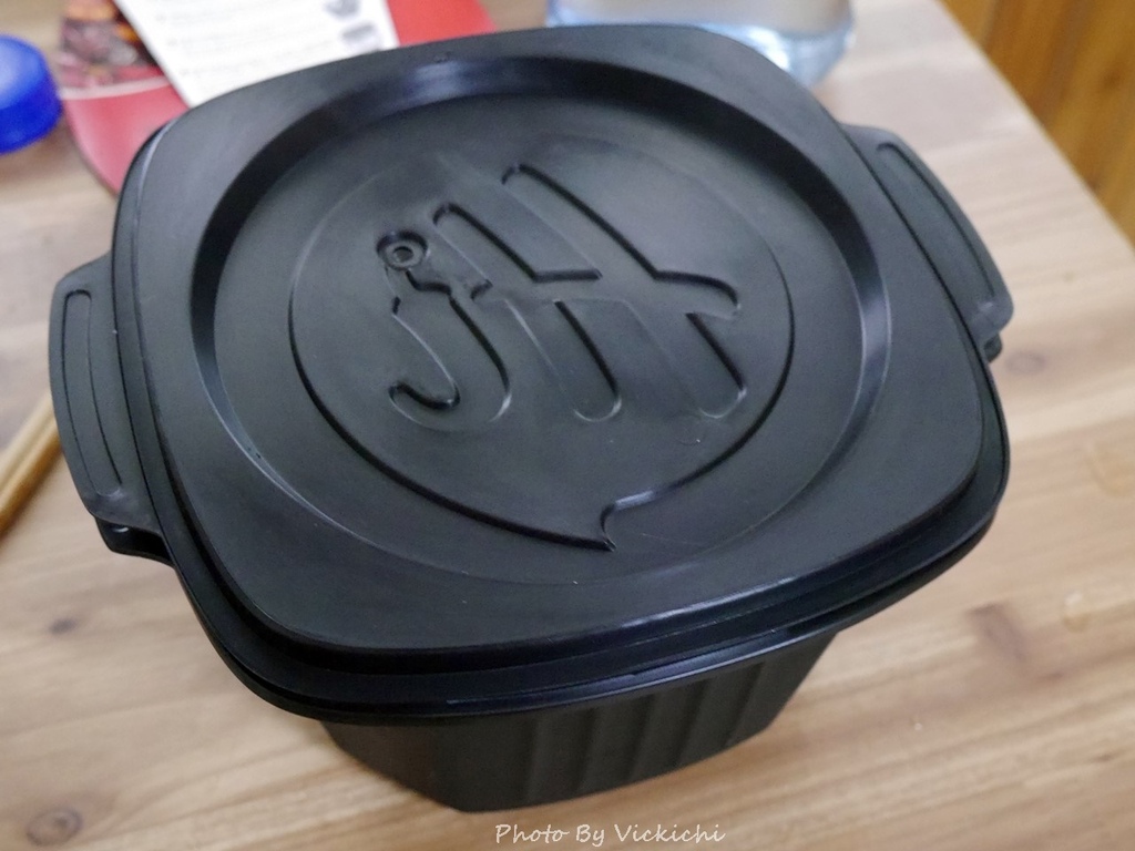 黑色的外鍋裡面有刻劃注水線,把白色的發熱包放進黑色外鍋裡面,蓋上蓋子等待15分鐘。煮的過程中,發出大量的水蒸氣在滾,靜靜地在旁邊等到不太滾的聲音後,就開蓋吃鍋。