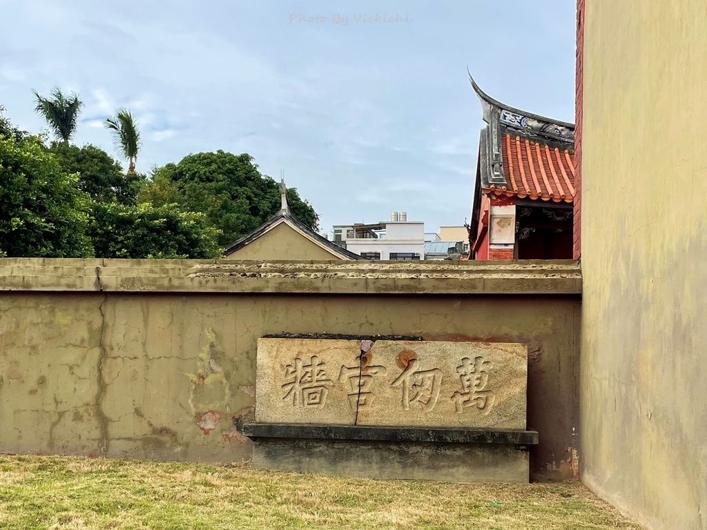 在孔廟左邊、靠近解說牌則有「萬仞宮牆」的石碑,典故取自論語子貢曰:「夫子之牆數仞,不得其門而入,不見宗廟之美,百官之富,得其門者或寡矣。」意思是指孔子的學問道德高深,若要求取上進,並無捷徑,唯有進黌門或泮宮(皆指古代的學校)潛心修習,才能窺其堂奧。這四個字在各地的孔廟的照壁上,皆寫有「萬仞宮牆」四字,表示儒門學問精深博大。