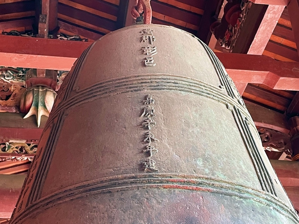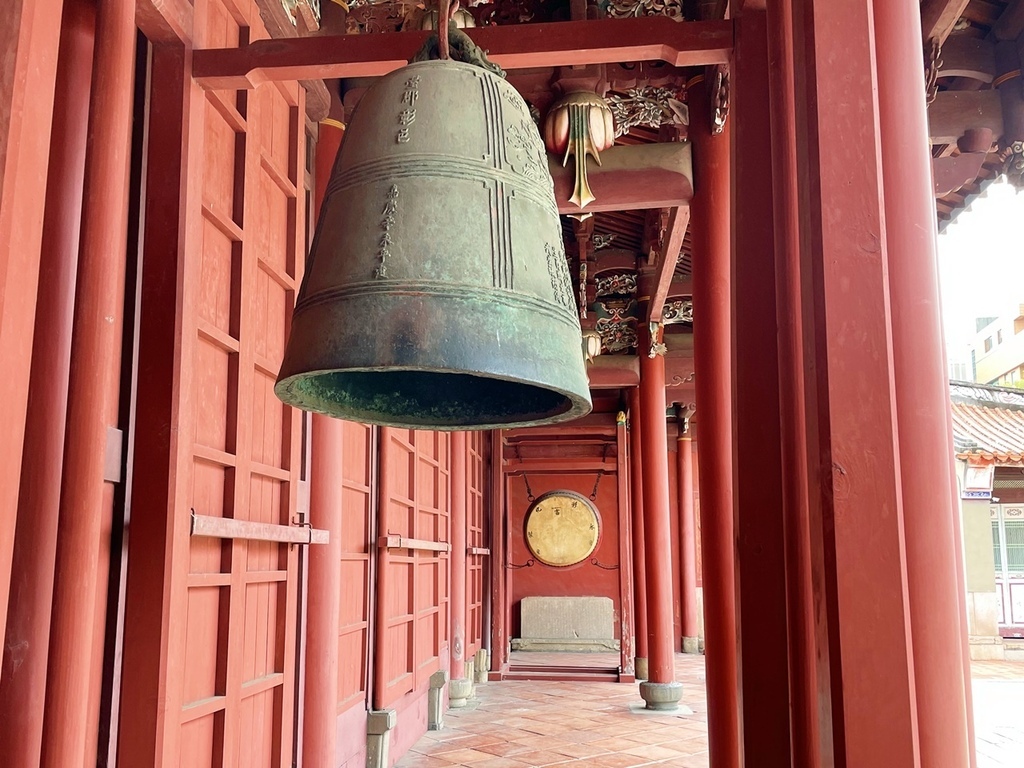 在戟門邊,左右分別掛上了晉鼓和鏞鐘,有暮鼓晨鐘的意思。孔廟的鏞鐘鐘紐是龍子蒲牢造形,鐘體外形上寬下窄,鐘體表面紋飾與字體皆為浮雕,用楷書的字體寫著「臺郡彰邑嘉慶辛未年建」。