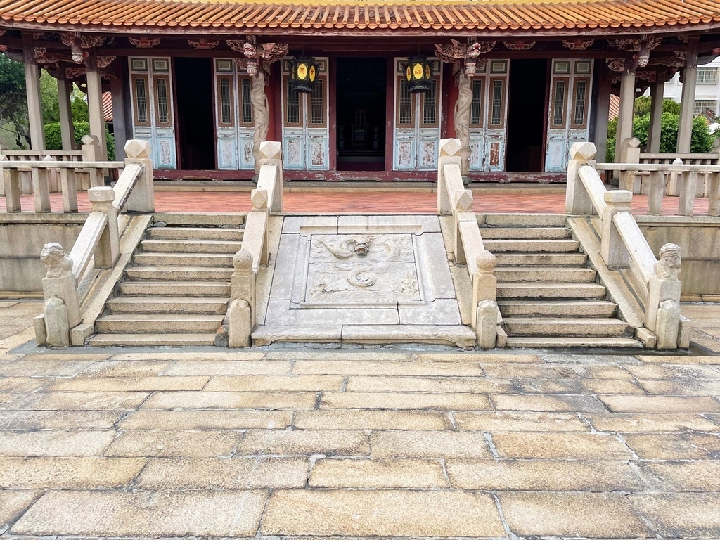大成殿前面的龍柱是西元1830年(道光10年)重修孔廟,使用泉州白石雕刻,採單龍盤柱之姿,左龍柱張口,右龍柱閉口,4爪握珠,柱身則裝飾雲紋及岩石,運用少許鏤空雕來呈現立體感。