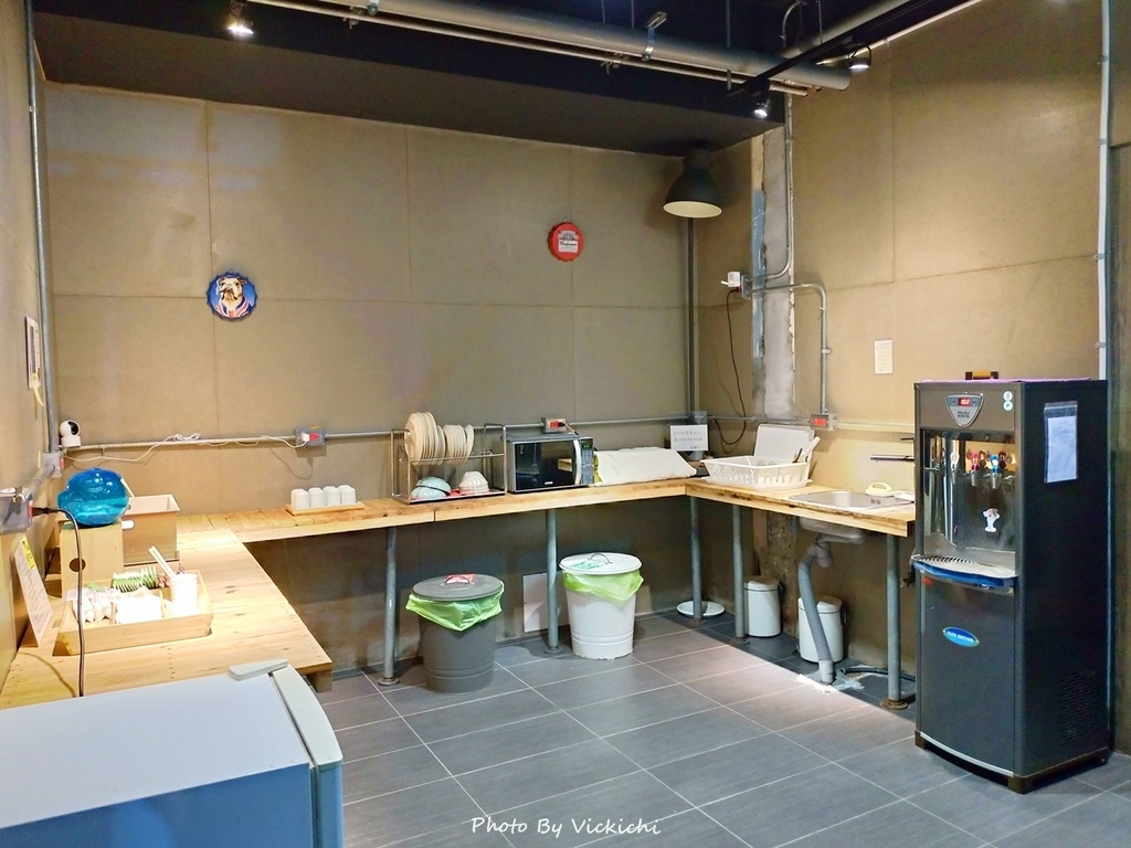 一樓的茶水間的桌上販售盥洗用備品跟洗衣粉,如果需要可以投錢購買。此外,旅店還提供一條乾淨的毛巾供房客使用。旅店提供飲水機、冰箱、微波爐、餐盤餐具,買食物回來的房客,這時候需要冷藏或加熱都非常方便。