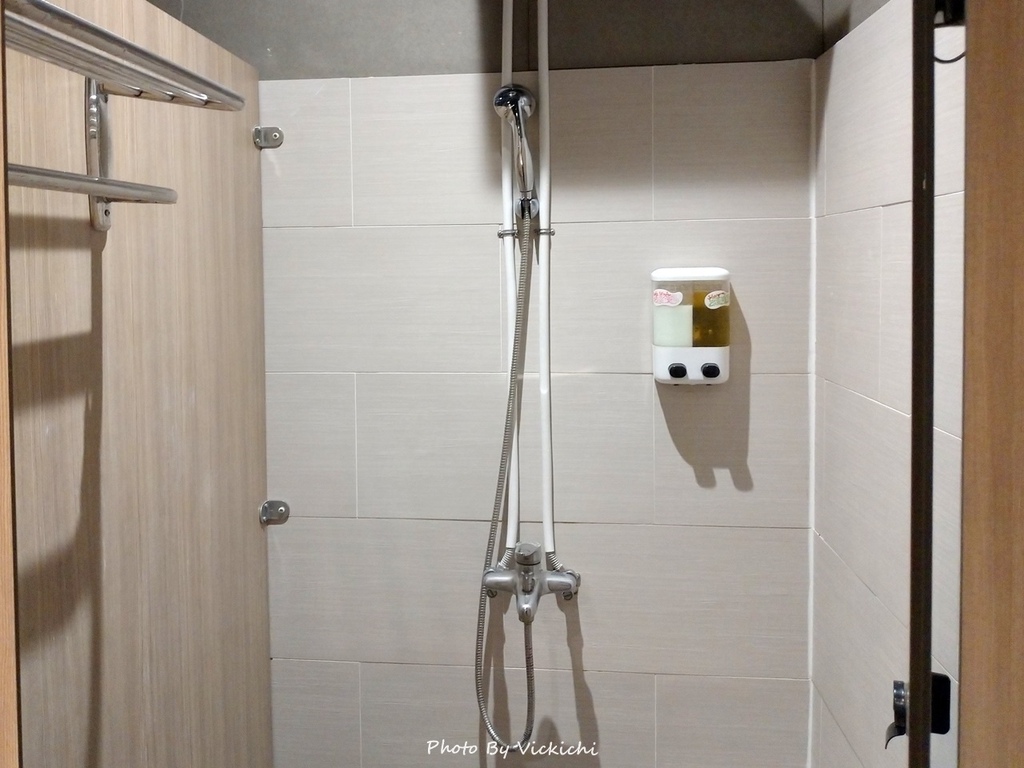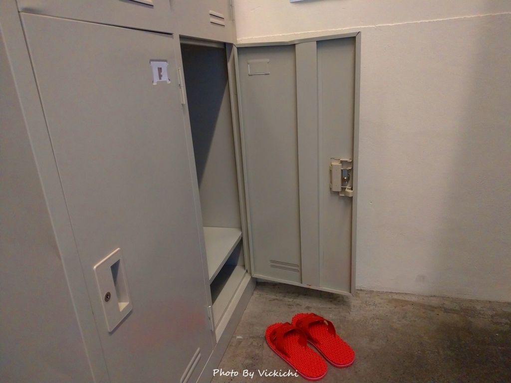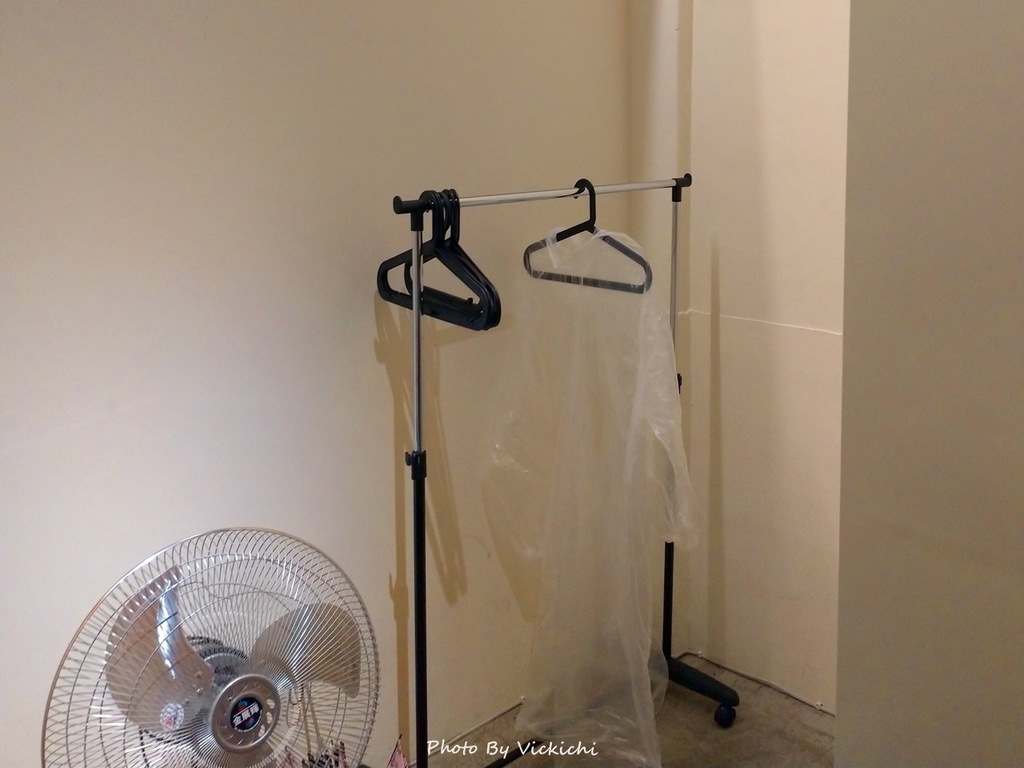 每個床位都附有一個可以鎖的大置物櫃,放上一個約20吋行李箱都還綽綽有餘,裡面還有提供拖鞋換穿,靠牆則是擺了曬衣架、大電風扇跟垃圾桶,可以吊掛外套等衣物,我把輕便雨衣暫掛在這裡稍微晾一下!
