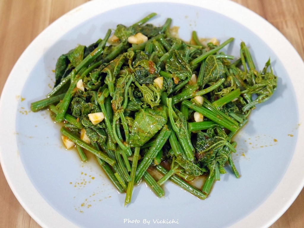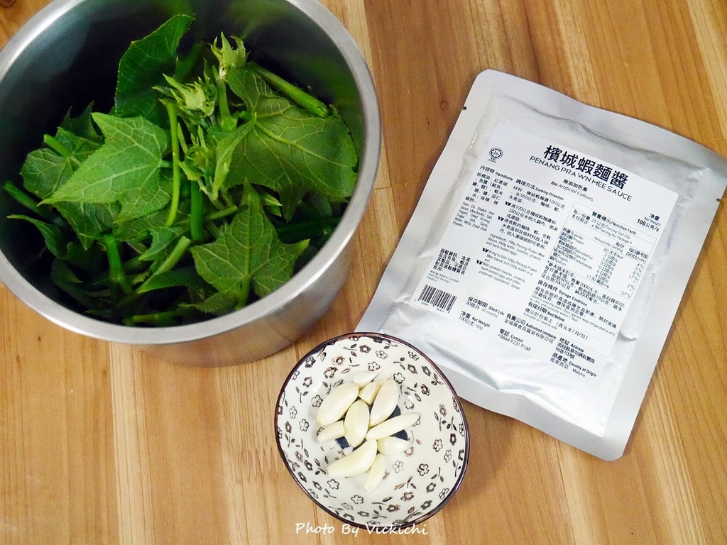 材料:蒜頭適量、龍鬚菜一把、水 1/3杯、福華牌檳城蝦麵醬2匙