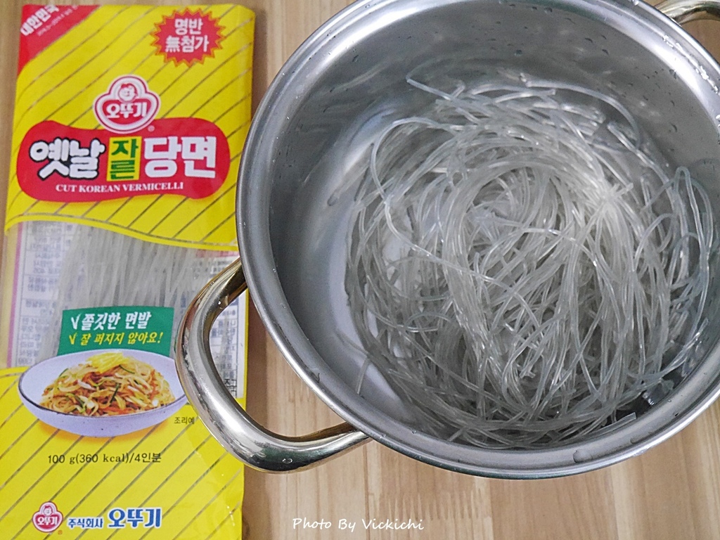 拿出買很久的韓式冬粉,原本要拿來雜菜(잡채),後來拿來煮蝦麵醬海鮮韓式冬粉,韓式冬粉使用的原料是地瓜,所以口感特別Q,很適合原本就很愛Q彈口感的人。