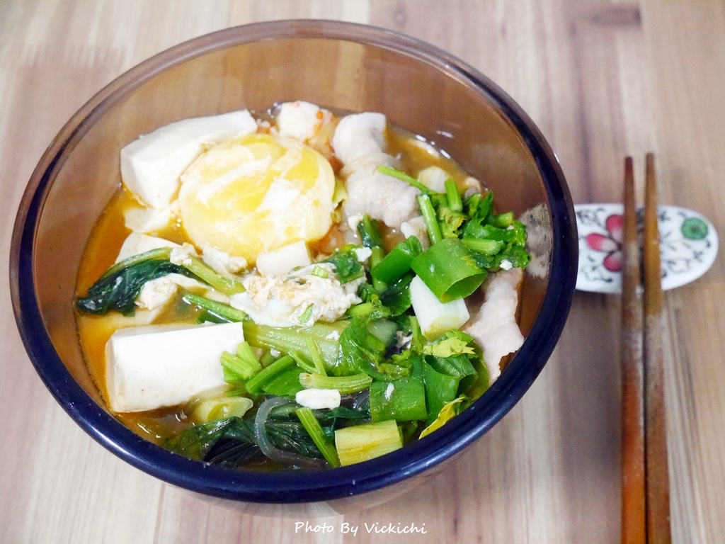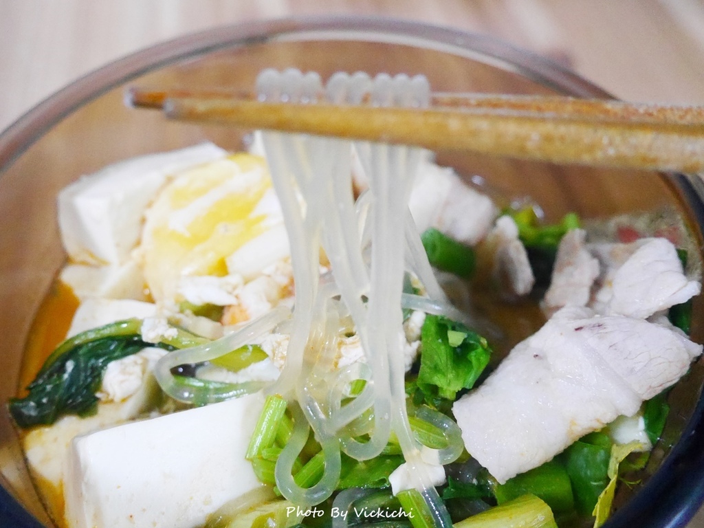 材料:蝦子適量、豆腐一盒、五花肉適量、蛋兩顆、青江菜一把、韓式冬粉一把、水500c.c.、福華牌檳城蝦麵醬半包
