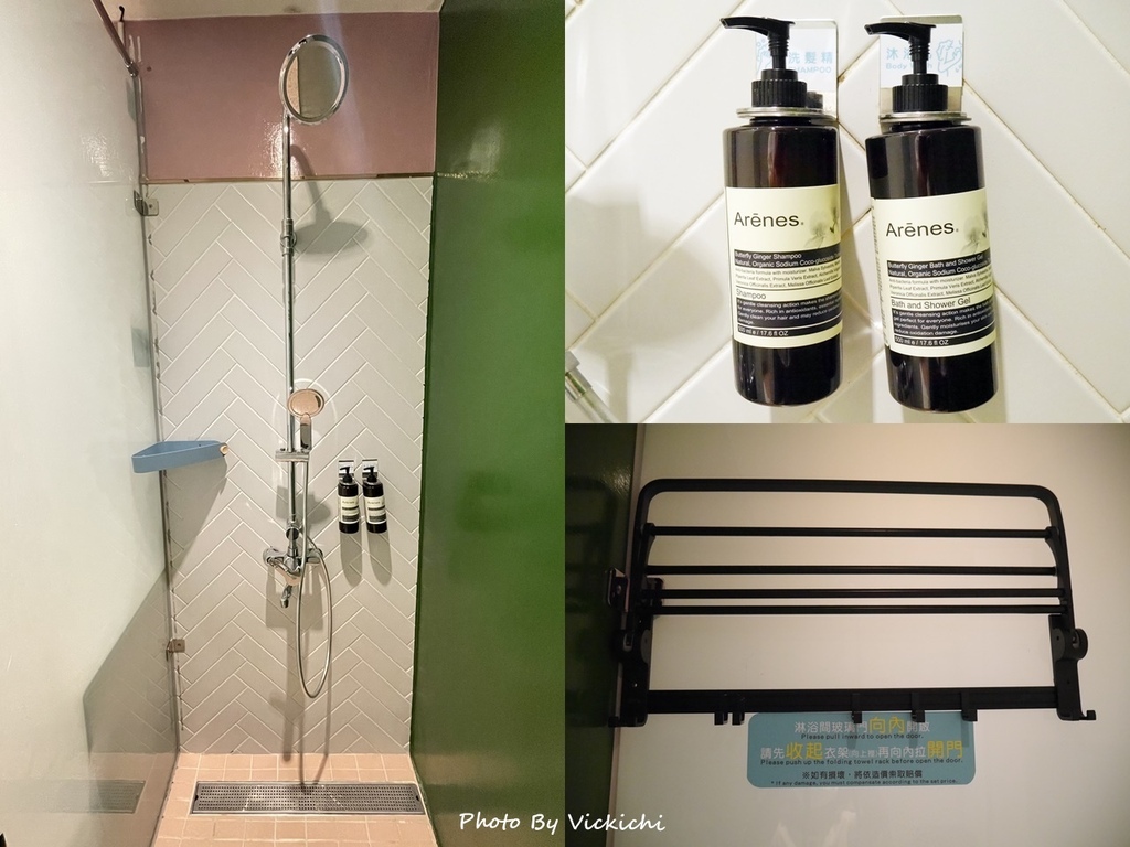 淋浴間的空間非常明亮乾淨,旅店是必須自備盥洗用品,淋浴間有沐浴乳跟洗髮乳可以使用,淋浴間的伸縮衣架設計,開門的時候,要記得把衣架收回,整體還算滿意,只是蓮蓬頭的水量小,非常可惜。