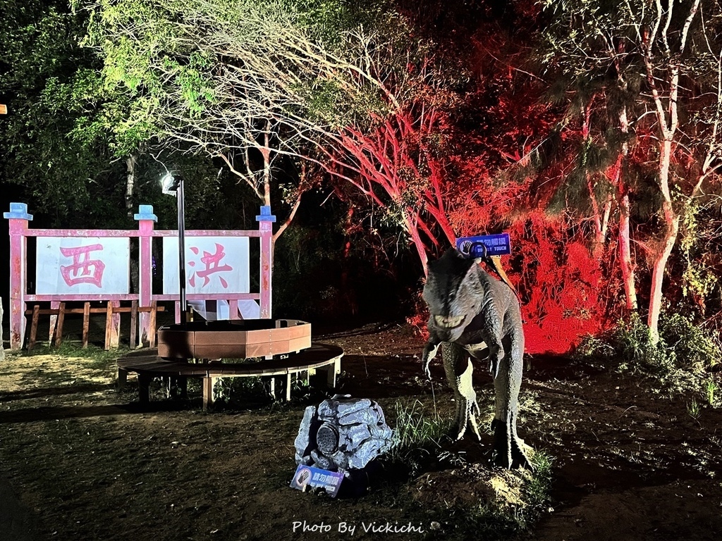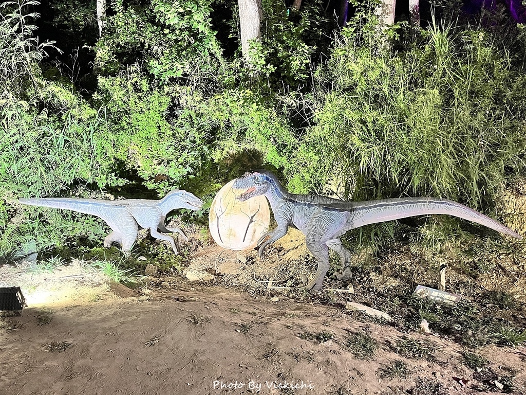 隨著燈光的變化,讓整個會場更有氛圍。有趣的是,參觀的路上,迎面而來看到三隻恐龍,準備到恐龍區和小朋友們玩樂。看著搖搖晃晃的恐龍,想必躲在恐龍身體裡面,應該超熱的!