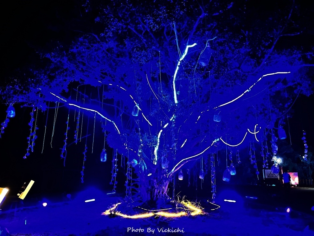 抵達營區後,首先會看到地球之簾,這是在西洪營區的樹上掛滿回收的寶特瓶,下方黃色燈光是金門島的形狀,這個意涵著在金門島上長出了一棵希望之樹,可惜樹上的寶特瓶不知道為什麼不見?不過,整個還是很有意境。