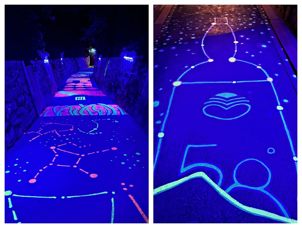 走在蒼穹海步道,步道上用螢光顏料畫上,宇宙星際的十二星座,經過十二星座後,接著出現的是金門古厝的圖案。最後,是最具代表的58度金門高粱酒圖案,整個地景藝術畫得很不錯,把金門的特色都畫出來。