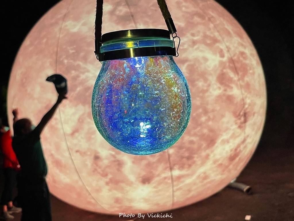 會場的底部,是這次星光節的亮點之一的金星女神,取自金門的『金』和星球迷航的『星』為意象,整個直徑大約有4米的球體,光看就非常大!剛好大球旁邊有快閃星球手提燈,閃閃亮亮的非常漂亮。站在這裡可以拍很多剪影照,可惜當時人實在太多了!