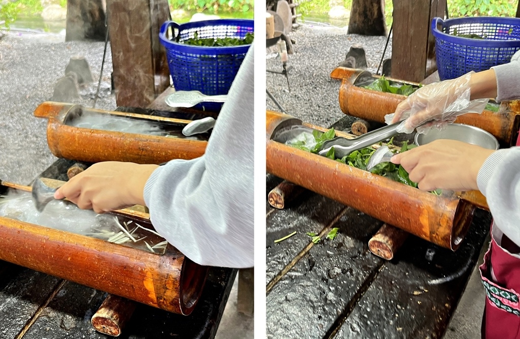 阿美族的傳統食煮鍋的煮法,用切開的巨竹或檳榔葉鞘作為容器,放入野菜、魚片、鹽巴和清水。用炭火將蛇紋石加熱到發燙呈現至白色,迅速將石頭夾起、丟進裝入食材的容器,利用石頭的熱度加溫煮沸,湯就立即沸騰滾燙,裡面的魚片自然就熟。