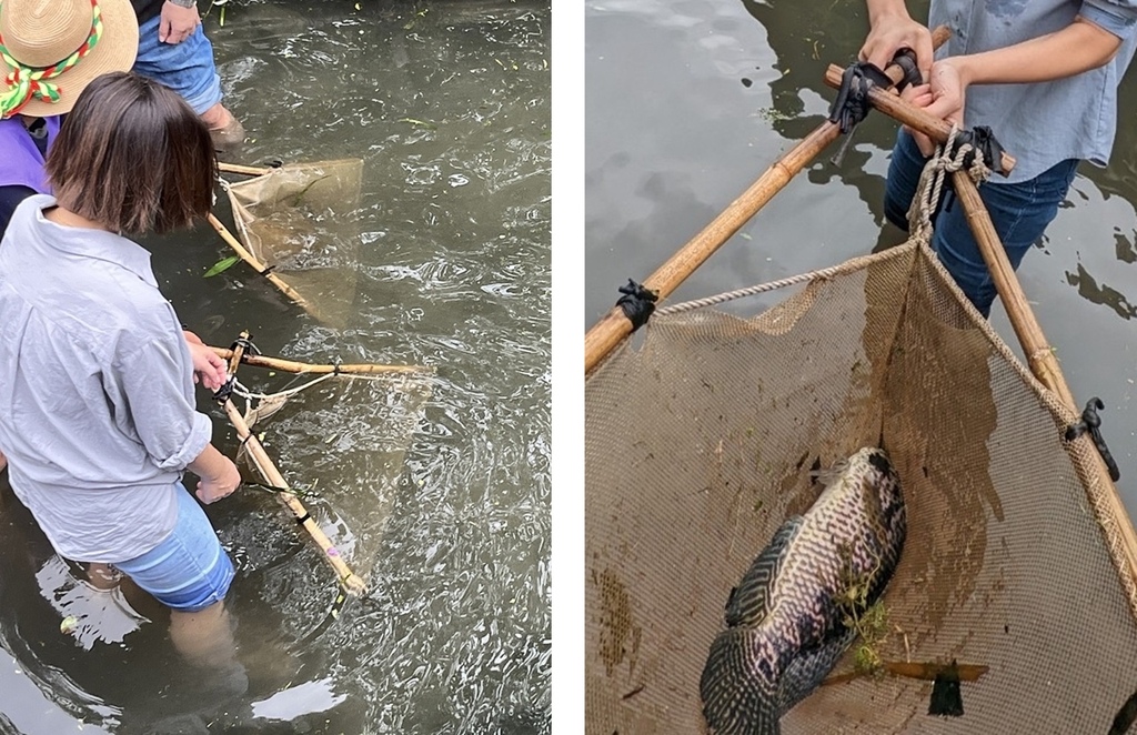 聽完解說後,我們紛紛下水體驗巴拉告捕魚法,實際操作起來,要用三角網撈起水中的大小魚獲,非常不容易,沒想到同事最後用三角網一撈,撈起一條魚,大家紛紛開玩笑說,這條魚也太配合了!