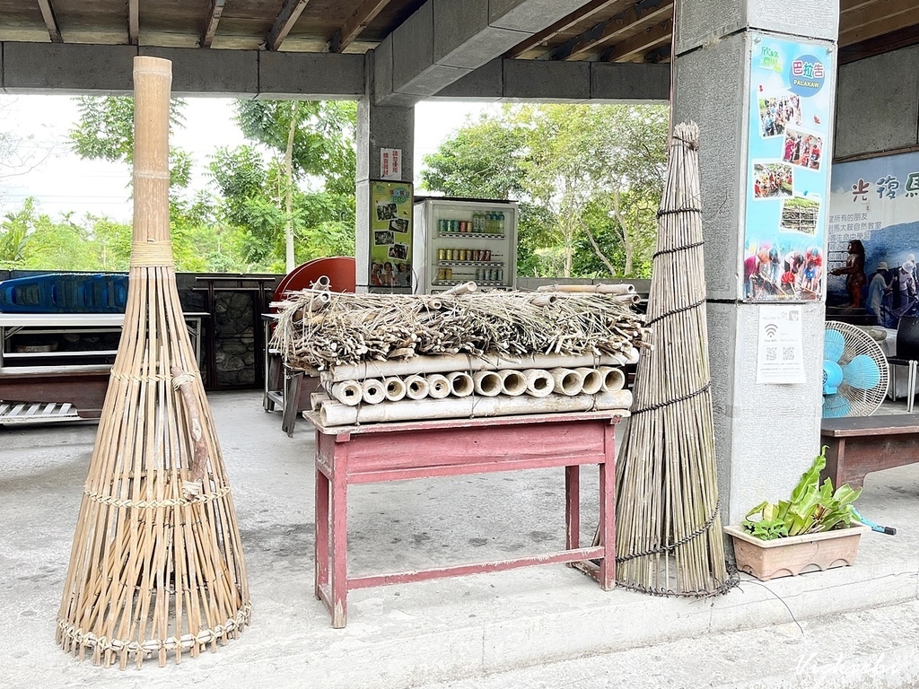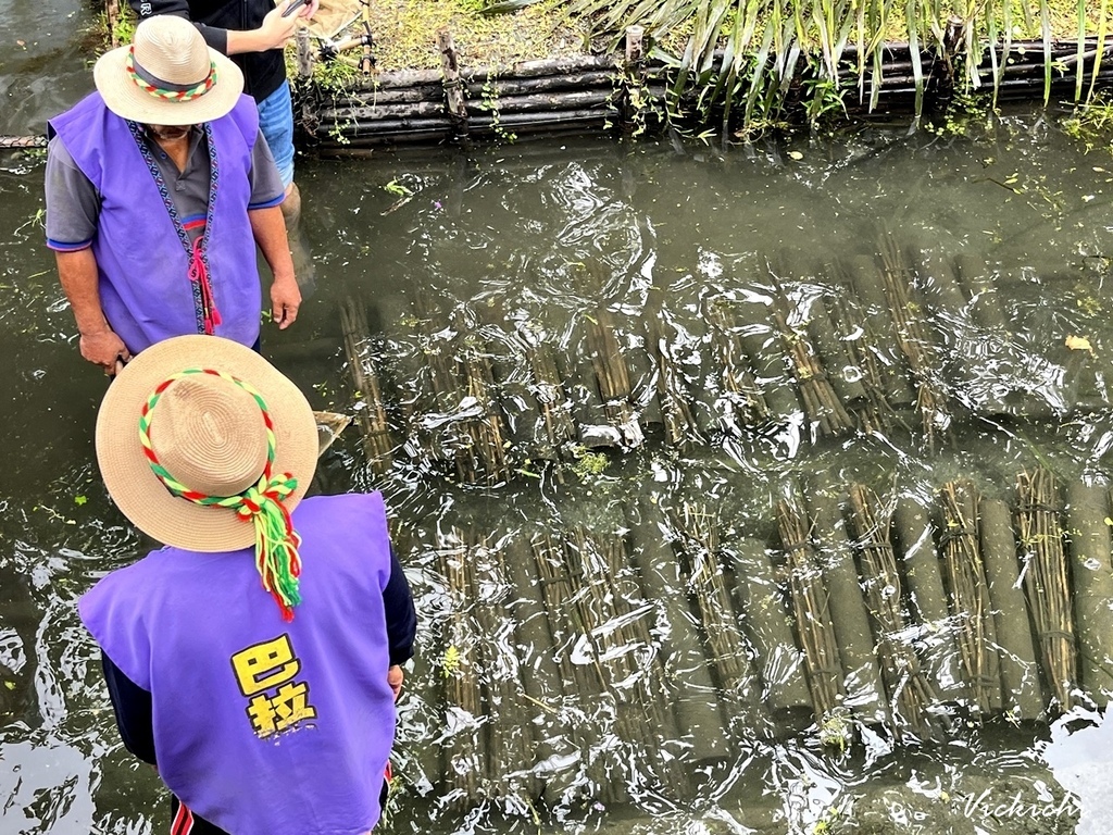 走進欣綠農園的捕魚體驗區,先來體驗巴拉告(Palakau)捕魚,這是阿美族傳統的捕魚法,跟一般捕魚不一樣的是,族人並非到處去捕撈,而是以竹筒、九芎木幫魚兒蓋好一棟屋子,放在池水當中,請魚來住,等魚兒們長大之後再撈起來食用。