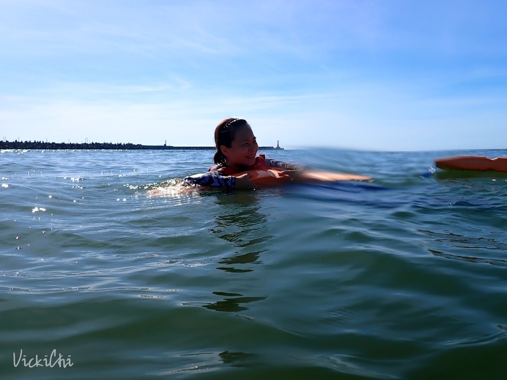 沿著美崙溪划了一趟獨木舟,接著我們划向出海口。在海上,教練說可以跳下獨木舟體驗海泳,看著同伴下水體驗海泳,感覺非常棒!不過,我還是會有些害怕,海泳這次就先pass!